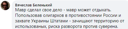 "Мавр сделал свое дело - мавр может отдыхать. Попользовав олигархов в противостоянии России и захвате Украины Штатами - зачищают территорию от использованых, риска разворота против суверена", - пишет журналист Вячеслав Беленький.