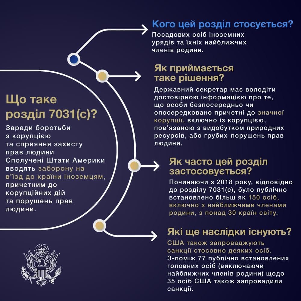 Основанием для санкций госсекретарь назвал раздел 7031 (с) закона США о финансировании Госдепа. Посольство Америки в Украине детально расписало, что это за норма.