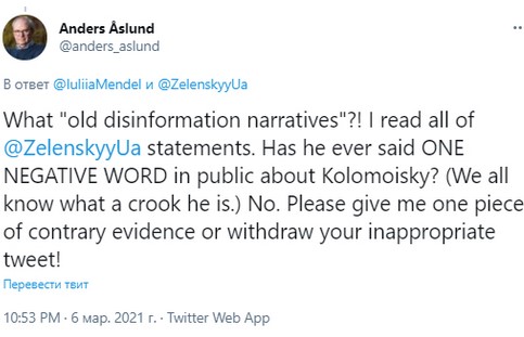 "Действительно? Он может назвать Коломойского? Бросить вызов олигархам – это вообще ничего не значит. Главная проблема – это Коломойский. Может Владимир Зеленский так сказать? Или он все еще привязан к нему? Почему все эти марионетки Коломойского до сих пор его депутаты?" – написал Аслунд.