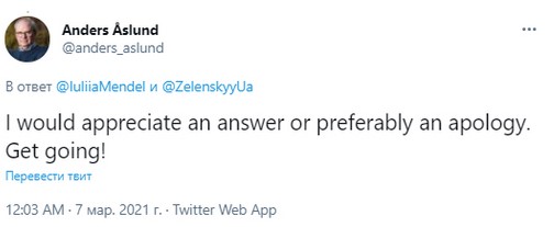 "Мистер Аслунд, я очень разочарована, что на вас так сильно повлияли слишком старые нарративы дезинформации. Надеюсь, вы говорите, опираясь на качественную аналитику, а не только из-за того, что вас уволили [речь об уходе из наблюдательного совета “Укрзализныци”]”, - резюмировала она.