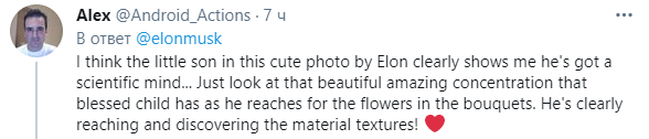 "Я думаю, маленький сын на этой милой фотографии Илона ясно показывает, что у него ум ученого... Просто посмотрите на удивительную энергетику, которую излучает благословенный ребенок, когда он тянется за цветами в букете. Он явно тянется и познает материю", - делится своими наблюдениями о фото Алекс.