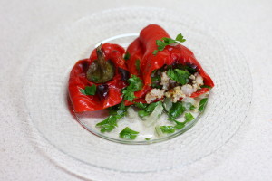 Для начинки пассеруем на масле предварительно нарезанную морковь, сельдерей, лук и капусту, добавляем соль и охлаждаем. Срезаем в виде крышечки верх каждого перца и вынимаем сердцевину с семенами. Кладем на 2 минуты в кипяток наши стручки и потом наполняем их овощным фаршем. Заливаем томатным соком и тушим около 20 минут.