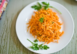 Измельчаем морковь и хрен (можно потереть на мелкой терке). Яблоки нарезаем мелкими кубиками, предварительно вынув сердцевину. Заправляем салат заправкой из лимонного сока с цедрой лимона, сахара и соли.