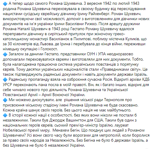 "Свобода народам! Свобода человеку!" - это ключевой лозунг борьбы украинских повстанцев. Украинская Повстанческая Армия и ее главнокомандующий Роман Шухевич воевали не только за свободу украинского народа, но и за свободу других порабощенных и угнетенных народов нацистским и коммунистическим режимами. И евреи тех времен это хорошо понимали. Поэтому присоединялись к УПА, помогали и поддерживали повстанцев", - добавил мэр.