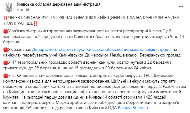 "На Киевщине значительно возросло количество больных Covid-19 и ОРВИ, поэтому власть применяет комплексные меры для нераспространения заболевания. Школьные каникулы могут способствовать ограничению социальных контактов и снижению рисков распространения вирусов. Вместе с тем в Киевской области продолжается кампания по вакцинации, которая позволит сформировать коллективный иммунитет", - рассказал председатель Киевской ОГА Василий Володин.