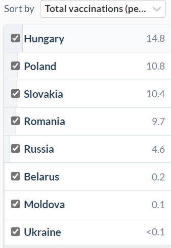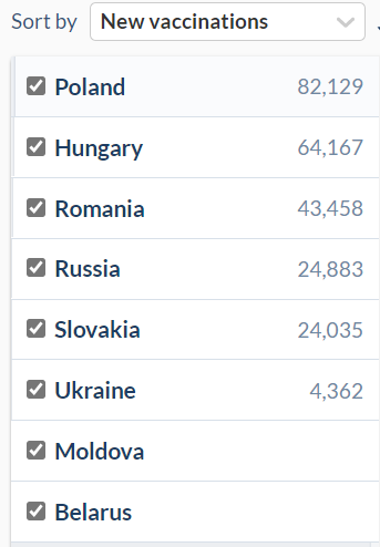 Понятно, что картина еще может измениться. Ведь Украина и Молдова начали вакцинацию позже всех в Европе. Да и Беларусь пока лишь ждет начала производства "Спутника V" у себя в стране.