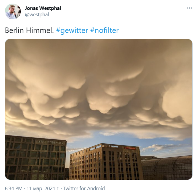 В небе над столицей Германии в течение получаса можно было наблюдать редкое природное явление - вымеобразные облака, которые образовались после грозового шторма.