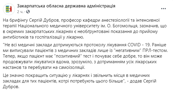 В некоторых больницах Закарпатья выявлены случаи необоснованного назначения антибиотиков больным коронавирусной инфекцией. Также некоторых больных госпитализировали при отсутствии показаний к этому.