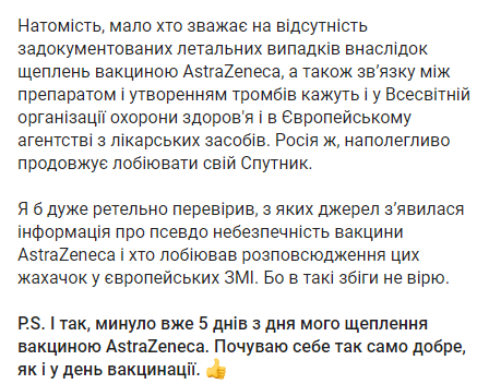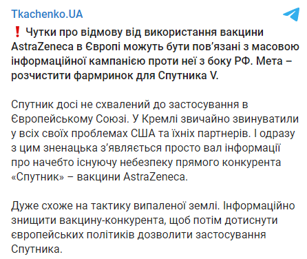 "Спутник (спутник V - российская вакцина - Ред.) еще не одобрен к применению в Европейском Союзе. В Кремле, конечно, обвинили во всех своих проблемах США и их партнеров. И сразу с этим неожиданно появляется просто вал информации о якобы существующей опасности прямого конкурента "Спутника" - вакцины AstraZeneca. Очень похоже на тактику выжженной земли. Информационно уничтожить вакцину-конкурента, чтобы потом дожать европейских политиков разрешить применение Спутника", - написал Ткаченко.