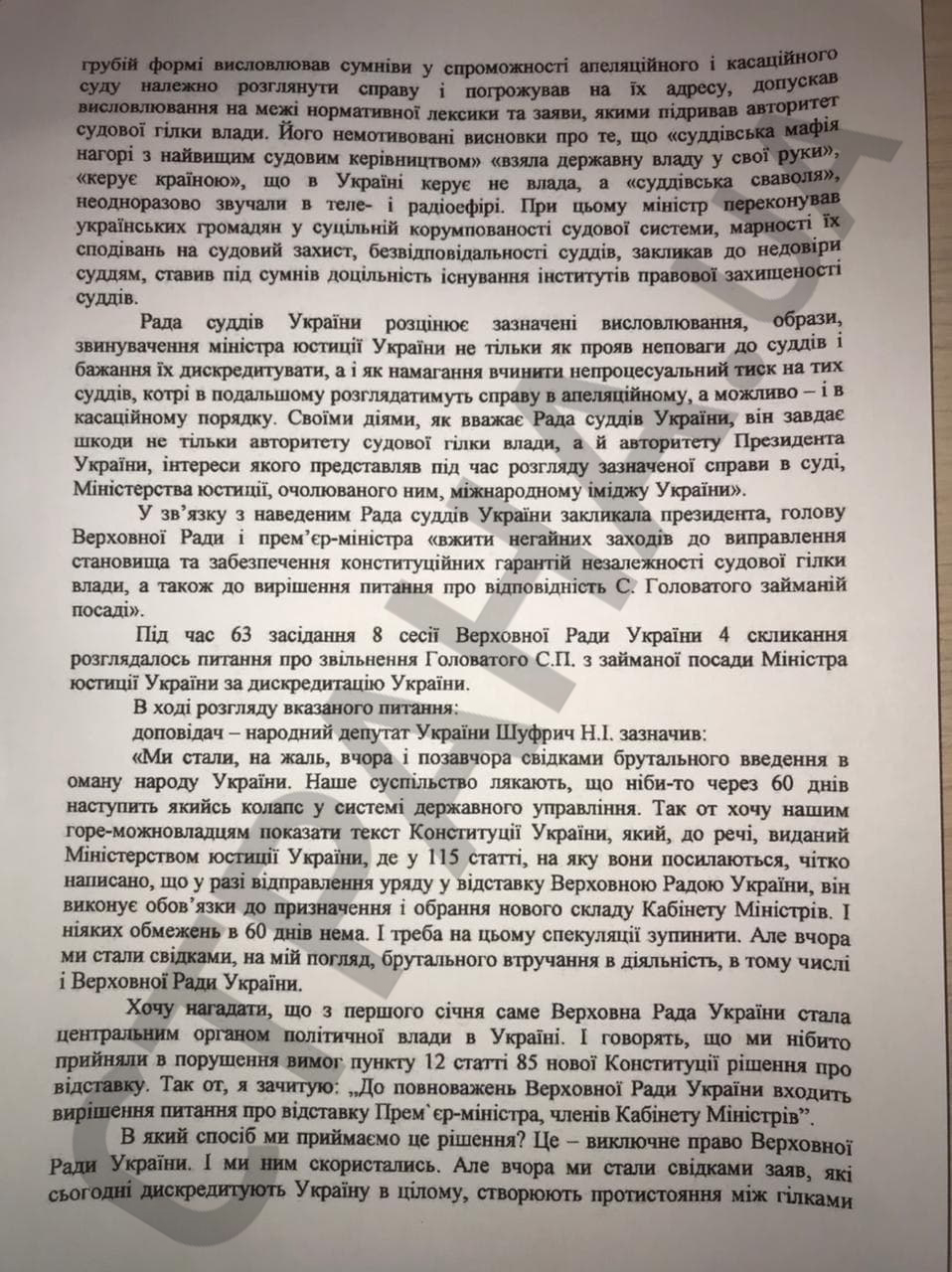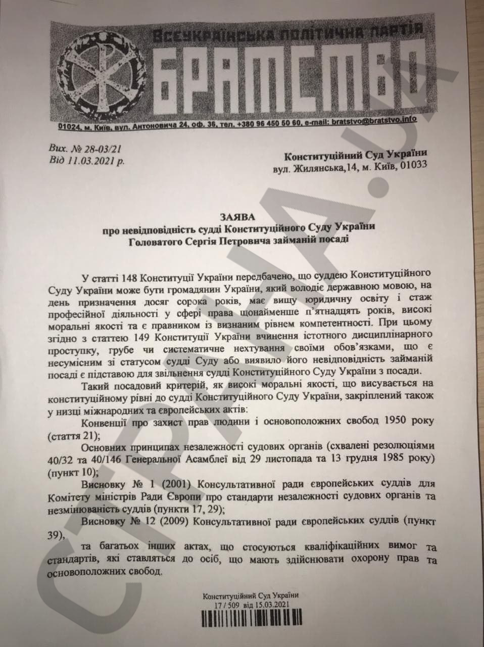 Основанием для этого стали обращения лидера Братства Корчинского и нардепа Лероса. Причём последний аргументирует необходимость убрать Головатого тем, что он... был в числе депутатов, голосовавших в 2010 году за Харьковские соглашения", - комментирует ситуацию телеграм-канал "Политика Страны"