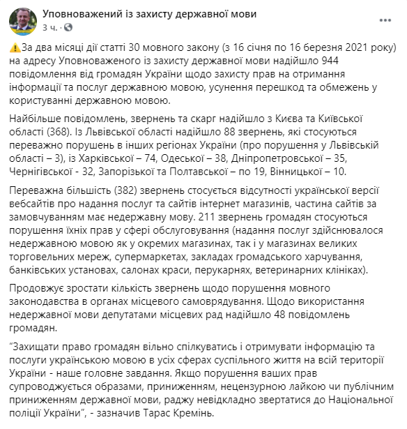 По словам омбудсмена, с 16 января по 16 марта он получил 944 жалобы о нарушении права на получение информации и услуг на государственном языке. Из Киева и области поступило 368 таких сообщений. На втором месте - Львовская область (88 обращений), на третьем - Харьковская область (74 сообщения).