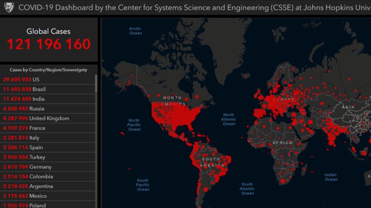 По данным на 18 марта, число зараженных на Земле перевалило за 121 миллион, фото: arcgis.com