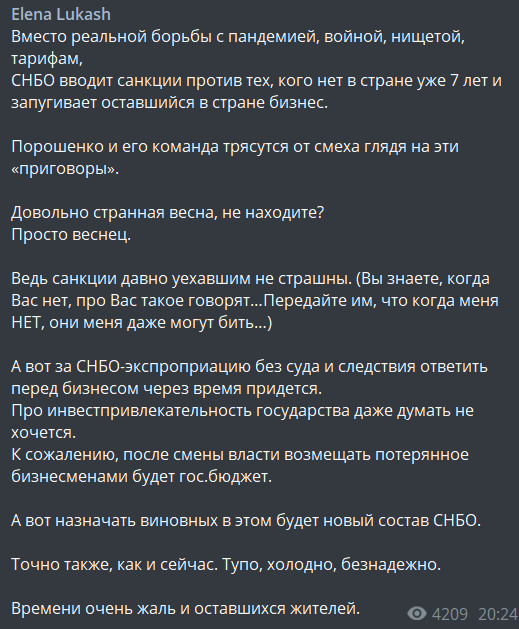 "Вместо реальной борьбы с пандемией, войной, нищетой, тарифам, СНБО вводит санкции против тех, кого нет в стране уже 7 лет и запугивает оставшийся в стране бизнес.