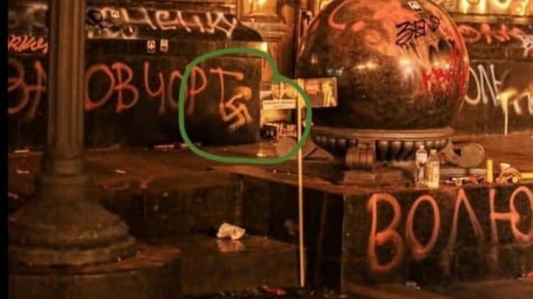 В ходе протестов возле здания Офиса президента в поддержку радикала Сергея Стерненко активисты разрисовали стены не только надписями и аббревиатурами, но и оставили после себя символ нацистской свастики.