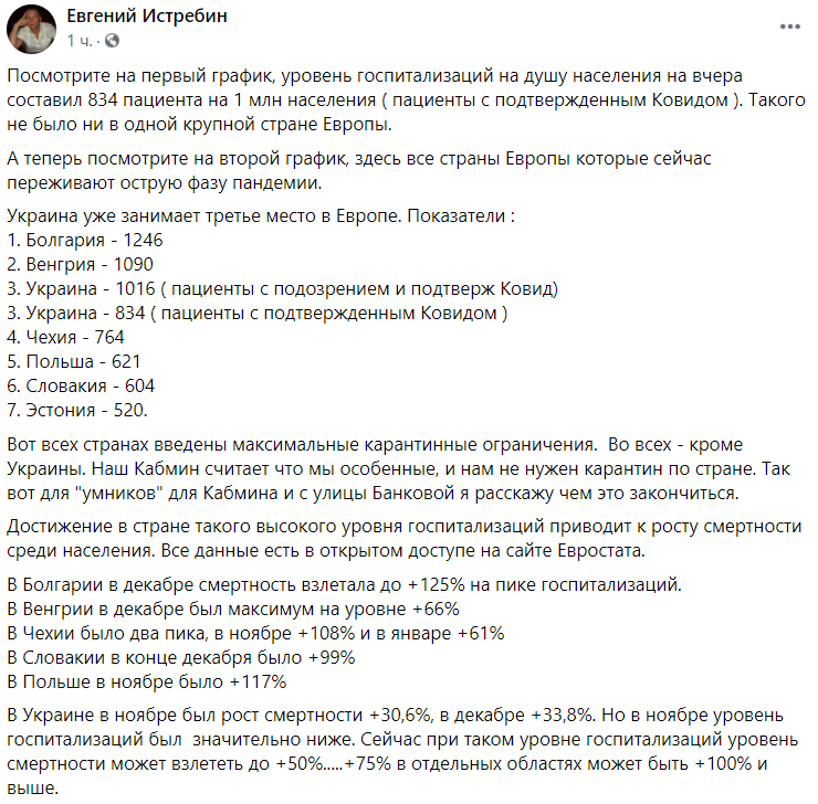 Блогер Евгений Истребин пересчитал показатель госпитализаций на миллион человек населения и сравнил, как с этим обстоит дело в Украине и Европе.