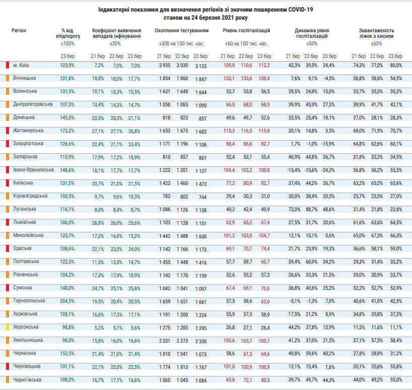По состоянию на утро среды, 24 марта, в "красной" зоне карантина в Украине находятся Киев и 8 областей. Еще два региона могут попасть в нее уже завтра.