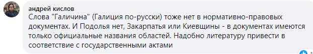 "Слова "Галичина" (Галиция по-русски) тоже нет в нормативно-правовых документах. И Подолья нет, Закарпатья или Киевщины - в документах имеются только официальные названия областей. Надобно литературу привести в соответствие с государственными актами".