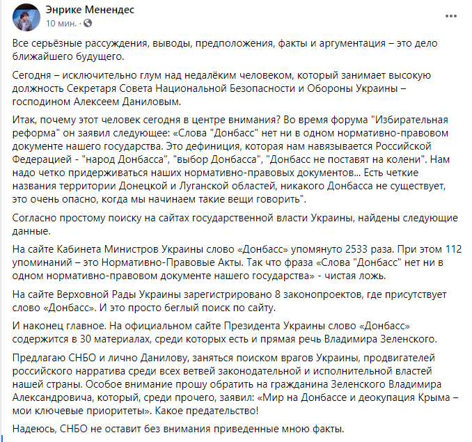 "Глава СНБО Данилов заявил, что никакого Донбасса не существует.
