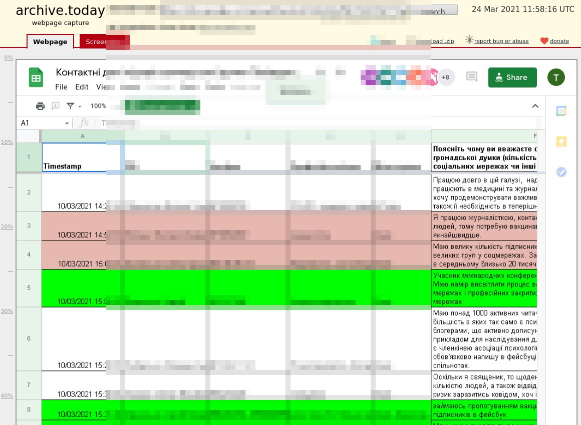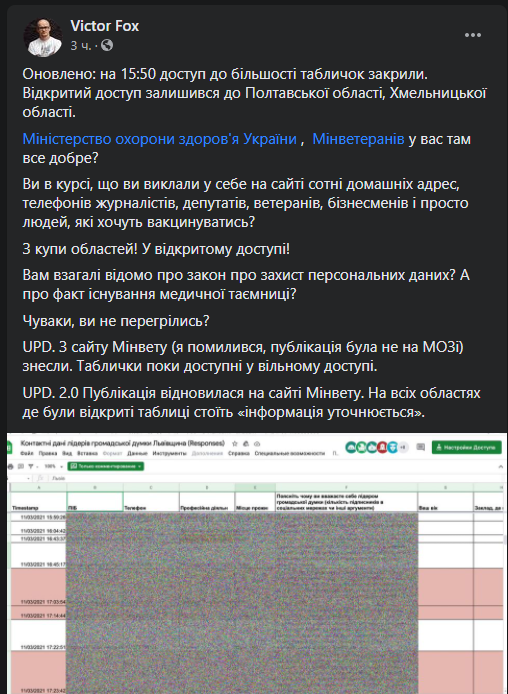 Оказалось, что в течение двух недель с начала кампании по вакцинации лидеров мнений, все данные, которые желающие получить вакцину оставляли в анкете на сайте МОЗ и Минветеранов, оказывались публичными. Ссылки на google-doc'и, которые должны быть в закрытом доступе, были доступны всем внимательным пользователям интернета.