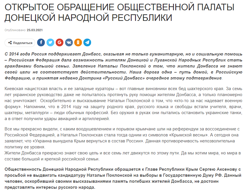 Согласно опубликованному на сайте "Общественной палаты ДНР" сообщению, Наталья Поклонская "оскорбила своими высказываниями память погибших жителей Донбасса", а значит, она "не достойна представлять интересы русского народа".