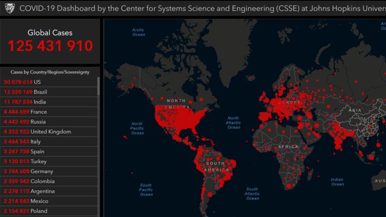 По данным на 26 марта, число зараженных на Земле приближается к 126 миллионам, фото: arcgis.com