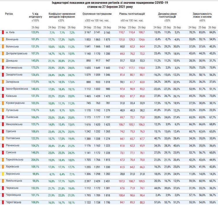В свежей таблице Минздрава от 27 марта в красной зоне Киев и 9 областей: