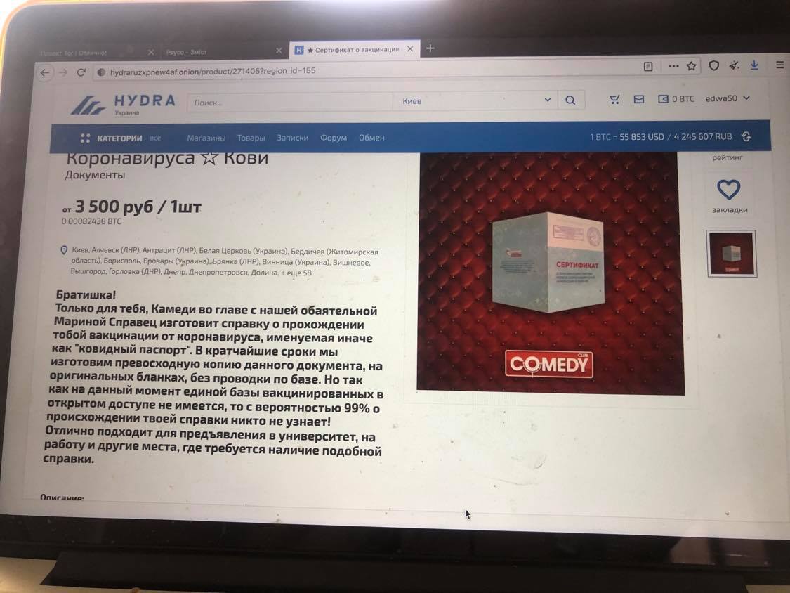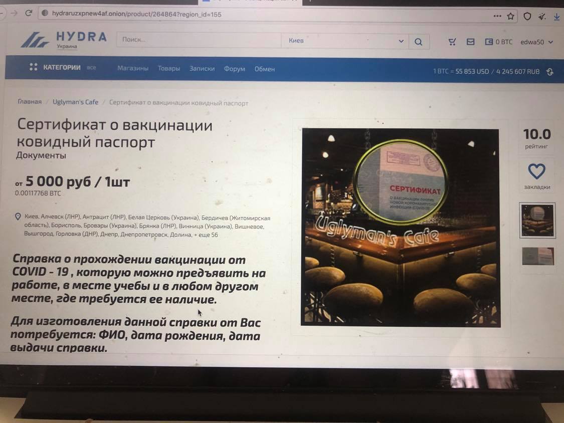 В частности, продавец Uglymans Cafe предлагает сертификаты о вакцинации и ковидные паспорта. Цены даны в рублях (от 5000 или 1,8 тысячи гривен) и биткоинах (0,001177768). Но в примечании указано, что продавец работает на Киев, Белую Церковь, Винницу, Вишневое, Вышгород, Днепр, Борисполь, а также города так называемых "ЛНР" и "ДНР" - Алчевск, Брянка, Горловка и др.