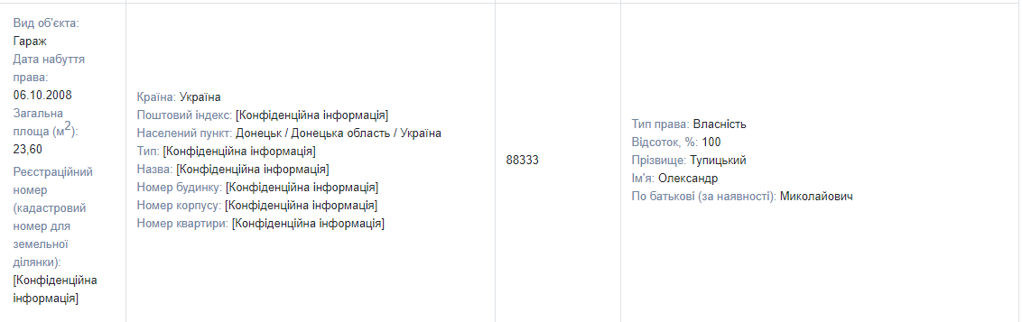 Скриншот: у Тупицкого среди имущества есть гараж в Донецке