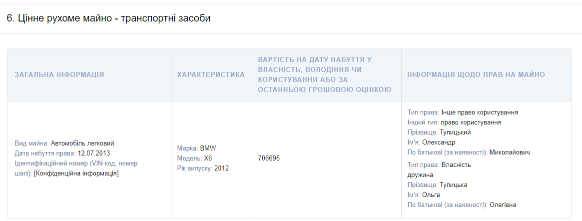 Тупицкий задекларировал также право пользования автомобилем BMW X6, которым владеет его жена с 2013 года.