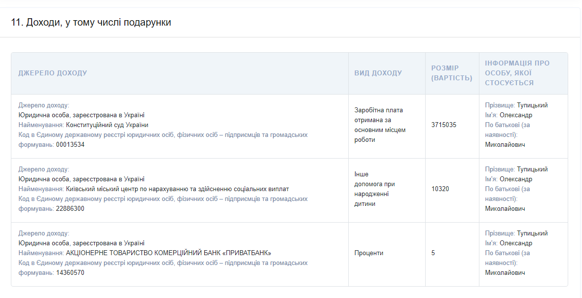 В КС за 2020 год Тупицкий получил 3,7 млн гривен. Также он получил 10 320 гривен помощи при рождении ребенка.