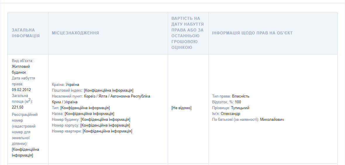 Скриншот: информация об имуществе Тупицкого на территории Крыма
