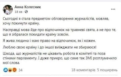 "Слуга народа" Колесник объявила, что "валит из страны" не навсегда, а на майские. А потом удалила пост