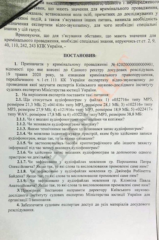 В постановлении сказано, что следствие хочет выяснить, "зафиксирована ли на аудиофайлах речь гражданина Джозефа Робинетта Байдена. Если да, то какие слова и высказывания произнесены именно им?"