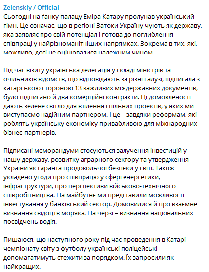 Он добавил, что во время визита украинская делегация в составе министров и руководителей ведомств, отвечающих за различные отрасли, подписала с катарской стороной 13 важных межгосударственных документов. Также было подписано и два коммерческих контракта.