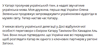 Президент добавил, что в Катаре прозвучал украинский гимн, "а в дальнейшем будет звучать украинский язык".