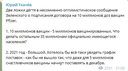 "Две ложки дегтя в несомненно оптимистическое сообщение Зеленского о подписания договора на 10 миллионов доз вакцин Pfizer.