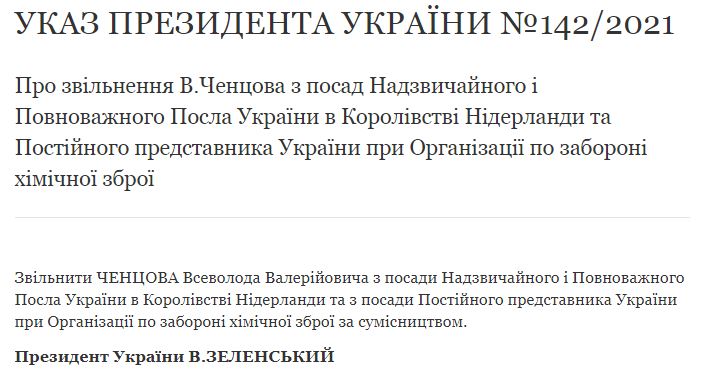 В частности, уволены посол Украины в Королевстве Нидерланды Всеволод Ченцов, посол в Бельгии, Люксембурге, представитель Украины при Европейском союзе Николай Точицкий, посол в Ираке Виктор Недопас, посол в Таиланде, Лаосе и Мьянме Андрей Бешта, а также посол в Саудовской Аравии, Султанате Оман и Йеменской Республике Вадим Вахрушев.
