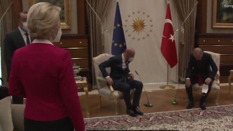 Глава Еврокомиссии Урсула фон дер Ляйен на переговорах с Реджепом Эрдоганом и главой Евросовета Шарлем Мишелем попала в неловкую ситуацию. В Анкаре на встрече президента Турции, глав Евросовета и Еврокомиссии, Урсуле фон дер Ляйен не хватило стула. Стороны были вынуждены рассесться на диванах.