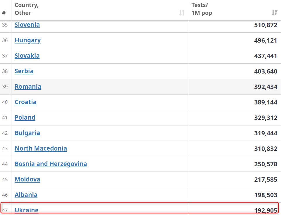 По тестам на миллион человек населения Украина сейчас находится вообще на последнем месте в Европе. Если даже при таком низком охвате тестированием страна бьет рекорды по смертности, то можно себе представить, какая цифра погибших на самом деле.