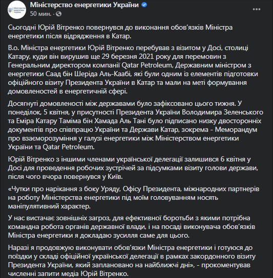 Также в Минэнерго рассказали о том, что Витренко вернулся к исполнению обязанностей министра энергетики после командировки в Катар 8 апреля. В Дохе он пребывал с 29 марта в рамках подготовки визита Зеленского в Катар.
