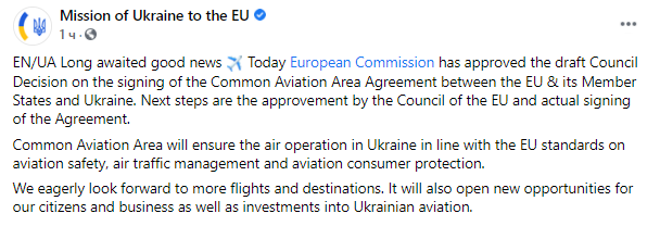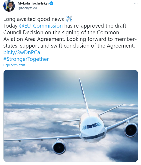 "Долгожданная новость: сегодня Европейская комиссия одобрила проект решения Совета о подписании Соглашения о совместном авиационном пространстве. С нетерпением ожидаем поддержки стран-членов и быстрого заключения соглашения", - написал украинский дипломат на своей странице в Твиттере.