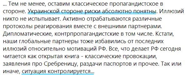 "Украинской стороне риски абсолютно понятны. Иллюзий никто не испытывает. Активно отрабатываются различные протоколы реагирования вместе с внешними партнерами. Дипломатические, контр-пропагандистские, в том числе. Кстати, наши глобальные партнеры тоже избавились от последних иллюзий относительно мотиваций РФ … Так или иначе, ситуация контролируется...", - написал Подоляк на своей странице в Facebook.