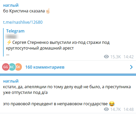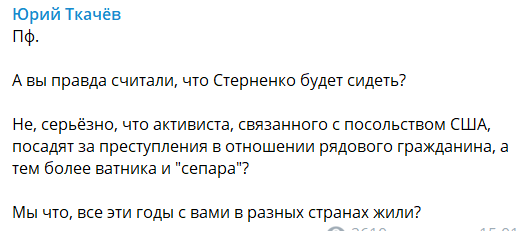 "Выпустили Стерненко под домашний арест. Слабая неубедительная власть – паруса надула убогим и безработным праздношатающимся, выдающим себя за гражданское общество: в следующий раз их будет в 100 раз больше под ОП, и они здание на камни разберут, а новые двери – на петину будку пустят".