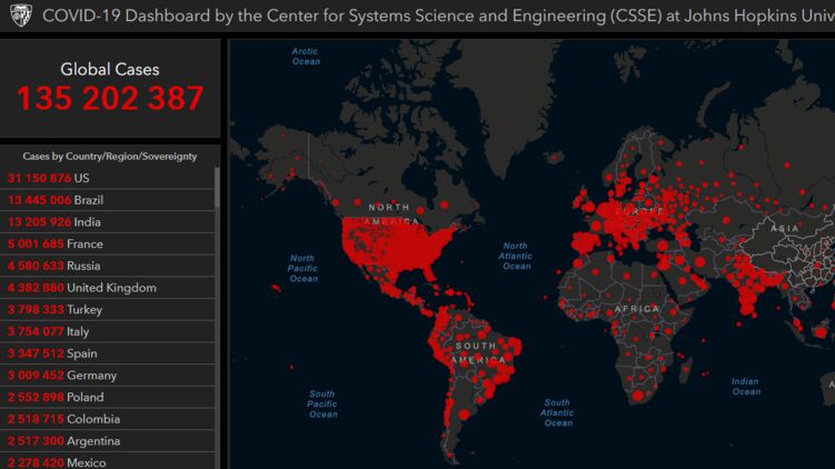 По состоянию на утро 11 апреля, число зараженных в мире перевалило за 135 миллионов, фото: arcgis.com