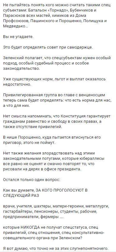 Как вы думаете, за кого проголосуют в следующий раз врачи, учителя, шахтеры, матери-героини, металлурги, гастарбайтеры, пенсионеры, студенты, рабочие, предприниматели, фермеры, которые никогда не получат спецстатуса, спецпривилегий, спецотношения, спец консультативно-совещательного органа при Зеленском?