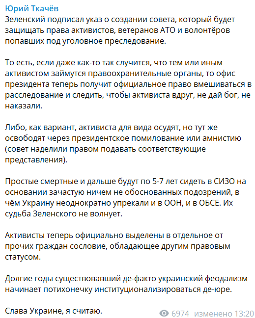 И вот в итоге Офис президента из всех категорий граждан, чьи права так или иначе нарушаются, в т. ч. и в рамках уголовных производств (а это, скажу по секрету, 95 % фигурантов таких производств, даже тех, кто думает, что шарит) решили особо нуждающихся в защите именно активистов.