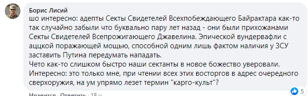 "Шо интересно: адепты Секты Свидетелей Всехпобеждающего Байрактара как-то так случайно забыли, что буквально пару лет назад - они были прихожанами Секты Свидетелей Всепрожигающего Джавелина. Эпической вундервафли (от нем. Wunderwaffe, "чудо-оружие" - Ред.) с аццкой поражающей мощью, способной одним лишь фактом наличия у ЗСУ заставить Путина передумать нападать.