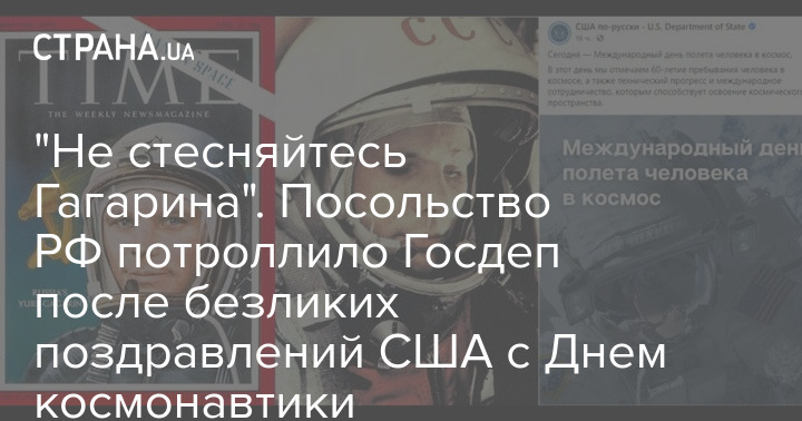 Россия прокомментировала "оригинальное" поздравление Госдепа США со Всемирным Днем космонавтики (ведомство 12 апреля поместило в сети фото американского астронавта, а имени Гагарина даже не упомянуло - Ред.).