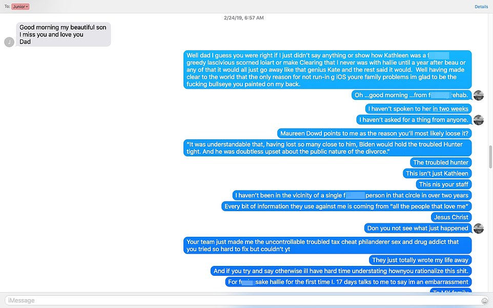 К 2019 году его тексты наполнены негодованием. Когда Джо написал сыну типичное любвеобильное сообщение: "Доброе утро, мой прекрасный сын. Я скучаю по тебе и люблю тебя. Папа", Хантер злился на своего отца за то, что он "дал понять миру, что единственная причина, по которой тот не баллотируется в президенты, - это его семейные проблемы"