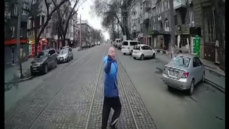 В Николаеве мужчина не успел сесть в трамвай и побежал перед ним, показывая средний палец. Видео